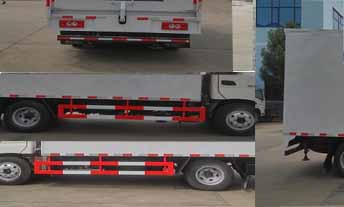 生産企業爲浙江亞太機電股份有限公司.ABS型号爲ABS-E, 生産企業爲威伯科汽車控制系統(中國)有限公司。側, 後防護裝置材料:Q235A碳鋼, 焊接, 後防護斷面尺寸(寬×高)(mm)50×100, 離地高430mm。車輛尾部選裝無拐臂。貨廂頂部封閉, 不可開啓。專用裝置:折疊式平台, 支腿, 頂棚, 作業時兩側側闆展開随頂部一起舉升, 側闆可向下展開平鋪形成舞台地闆, 内藏折疊式舞台闆。 | |||