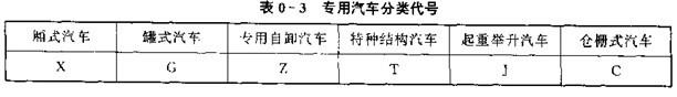 e、專用汽車分類代号,專用汽車分類代号位於産品型号的第五部公(對於汽車産品則沒有這部公代号),用反映車輛結構的用途特征的三個漢語拼音字母表示。其結構特征代号按表0-3的規定來标注。